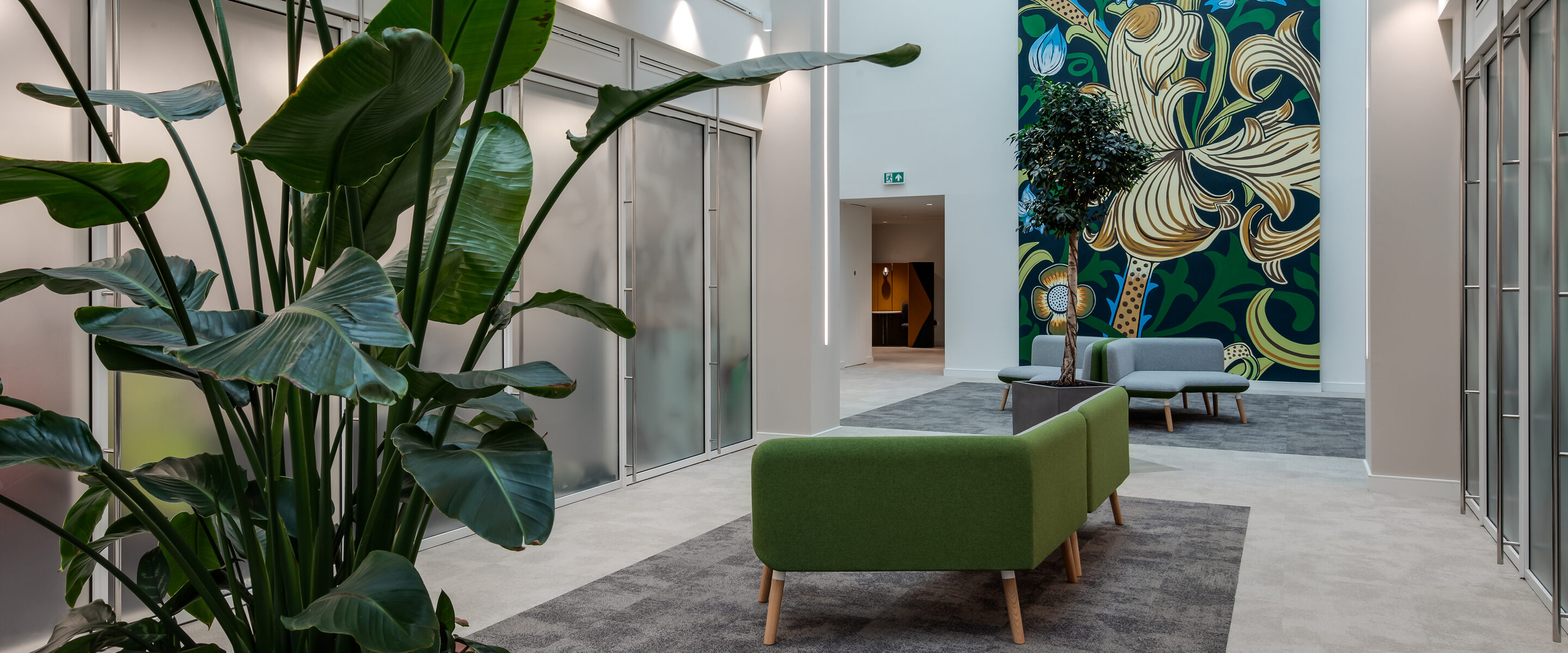 Grange Park is being developed with occupier’s wellbeing in mind. It offers a working environment that encourages collaboration, productivity, and a sense of community. The north end of The Street, the impressive 200m long atriumrunning the length of the building, has been transformed with a 12m high mural created by Andy ‘Dice’ Davies, local artist and director of Cheltenham Paint Festival. Andrew said, “This was an interesting challenge and the biggest indoor mural I’ve ever undertaken. I interpreted a mid-19th century design by William Morris to meet the brief of bringing the parkland into the building, into The Street”.