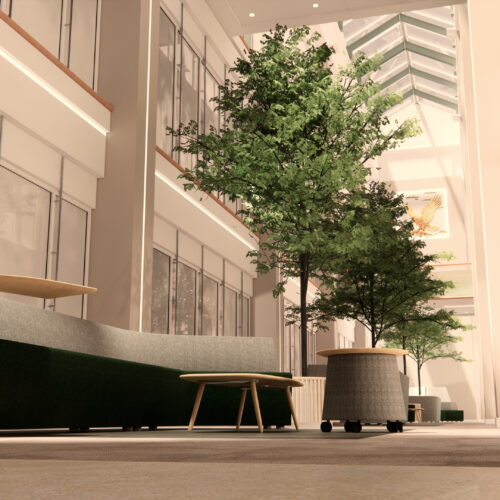 During the phase one work, which is on track for completion early June, the 185,000 sq ft office building is getting a redesigned reception, common areas and glazed atrium above a green boulevard – ‘The Street’ – with island planters plus new lighting, flooring and toilets.