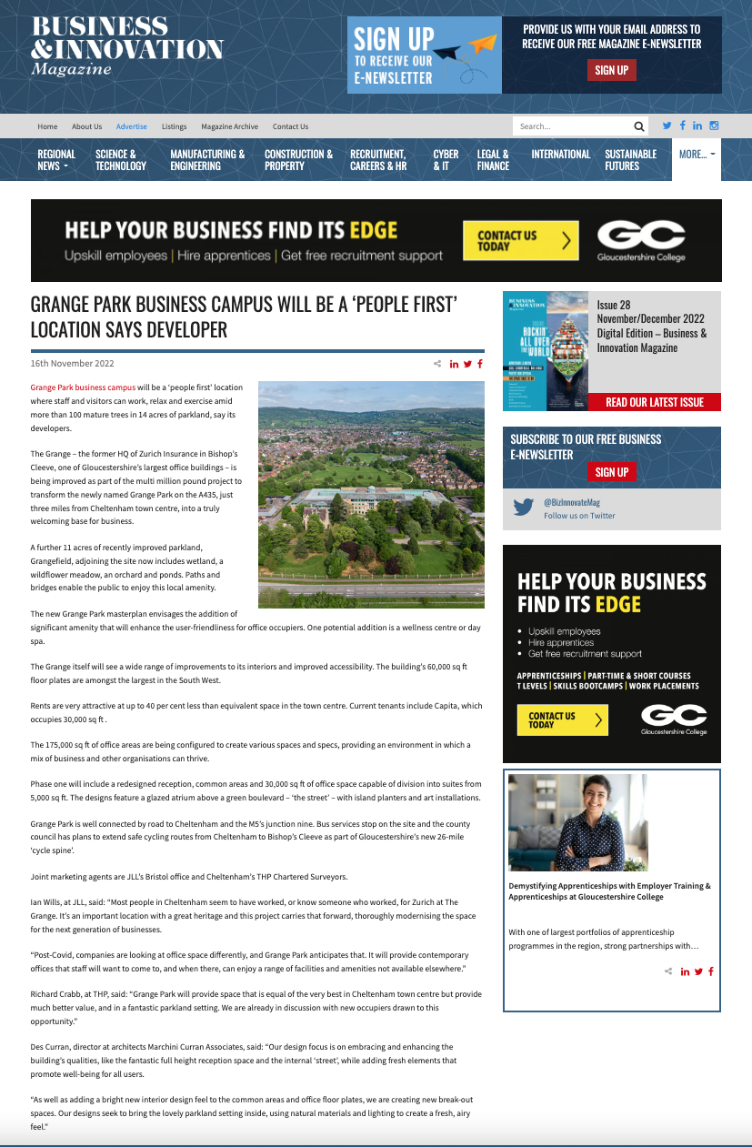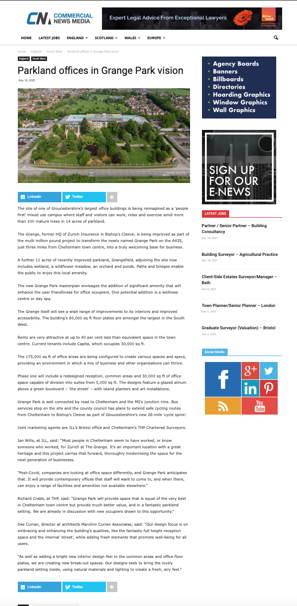 Richard Crabb, at THP, said: “Grange Park will provide space that is equal of the very best in Cheltenham town centre but provide much better value, and in a fantastic parkland setting. We are already in discussion with new occupiers drawn to this opportunity.”