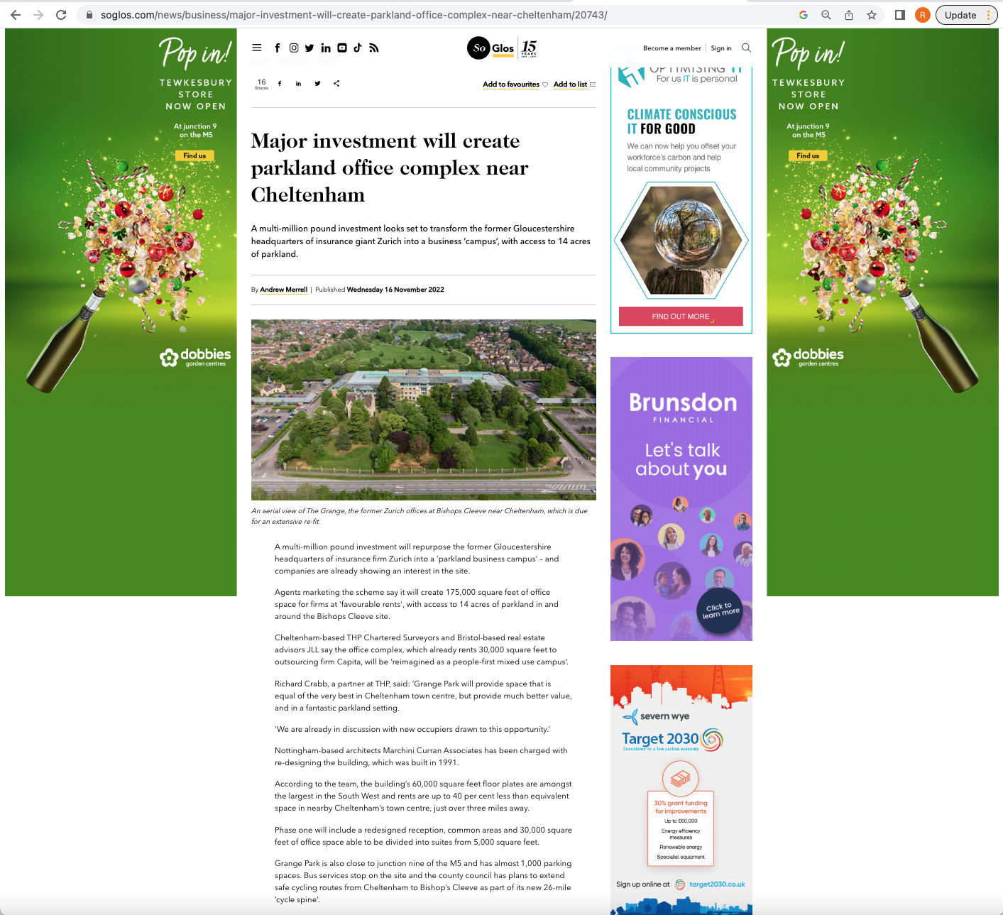 Joint marketing agents are JLL’s Bristol office and Cheltenham’s THP Chartered Surveyors. Ian Wills, at JLL, said: “Most people in Cheltenham seem to have worked, or know someone who worked, for Zurich at The Grange. It’s an important location with a great heritage and this project carries that forward, thoroughly modernising the space for the next generation of businesses.